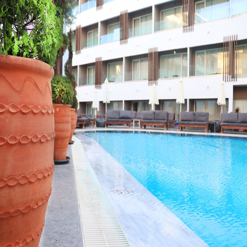 Lhôtel offre piscine extérieure pour adultes et enfants, chaises longues, parasols, wifi gratuit, parking privé et service détage, tout en étant à quelques minutes du centre-ville et de la plage dAktiKanari, accessibles via les navettes* mises à disposition par lhôtel pour un déplacement facile et pratique.